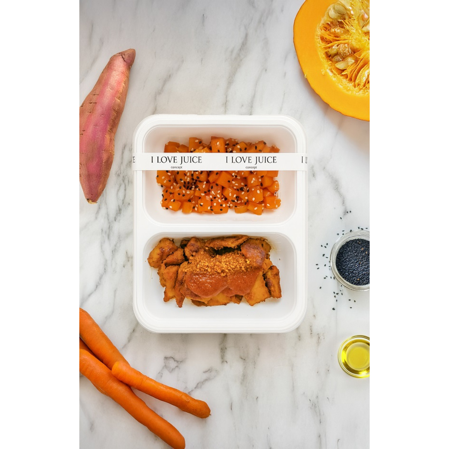 Wegański kurczak z białka grochowego, sos bbq, wegański parmezan z ekologicznych orzechów ziemnych, sałatka z pieczonych warzyw (marchewka, batat, dynia) pod ekologicznym sezamem. (400 kcal, Bl 44.6 g, W: 17.2 g, T: 16.3 g)
