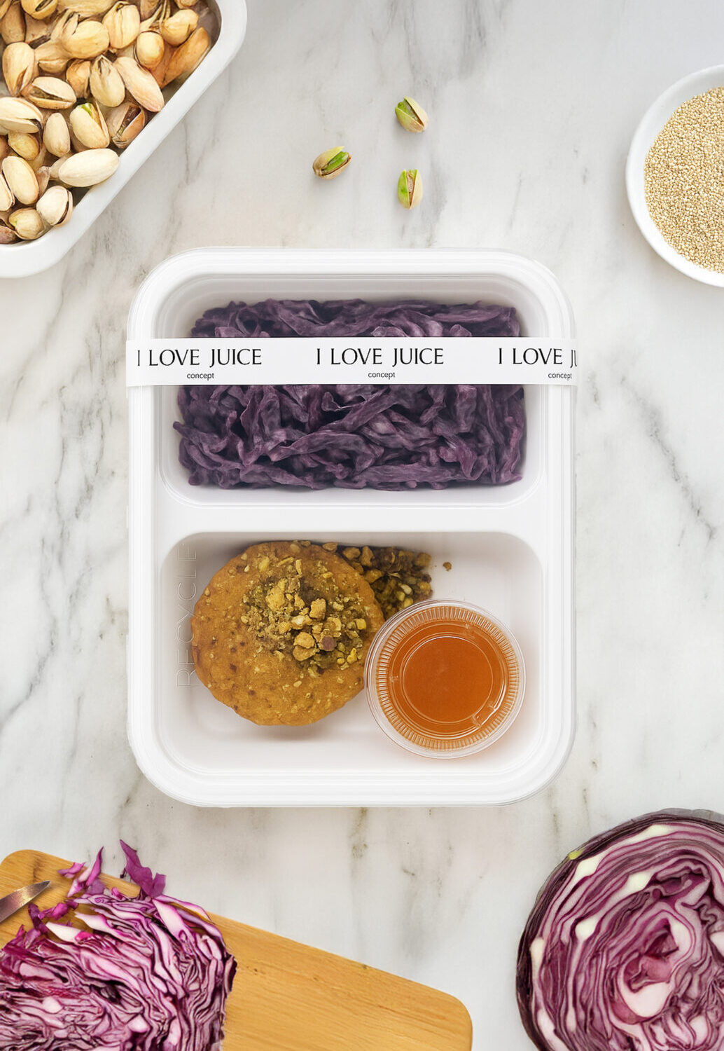 Burger z ekologicznej komosy ryżowej, domowy ketchup, pistacje, surówka colesław z wegańskim majonezem. (487 kcal, B: 17,7 g, W: 64,8 g, T: 19,3 g)