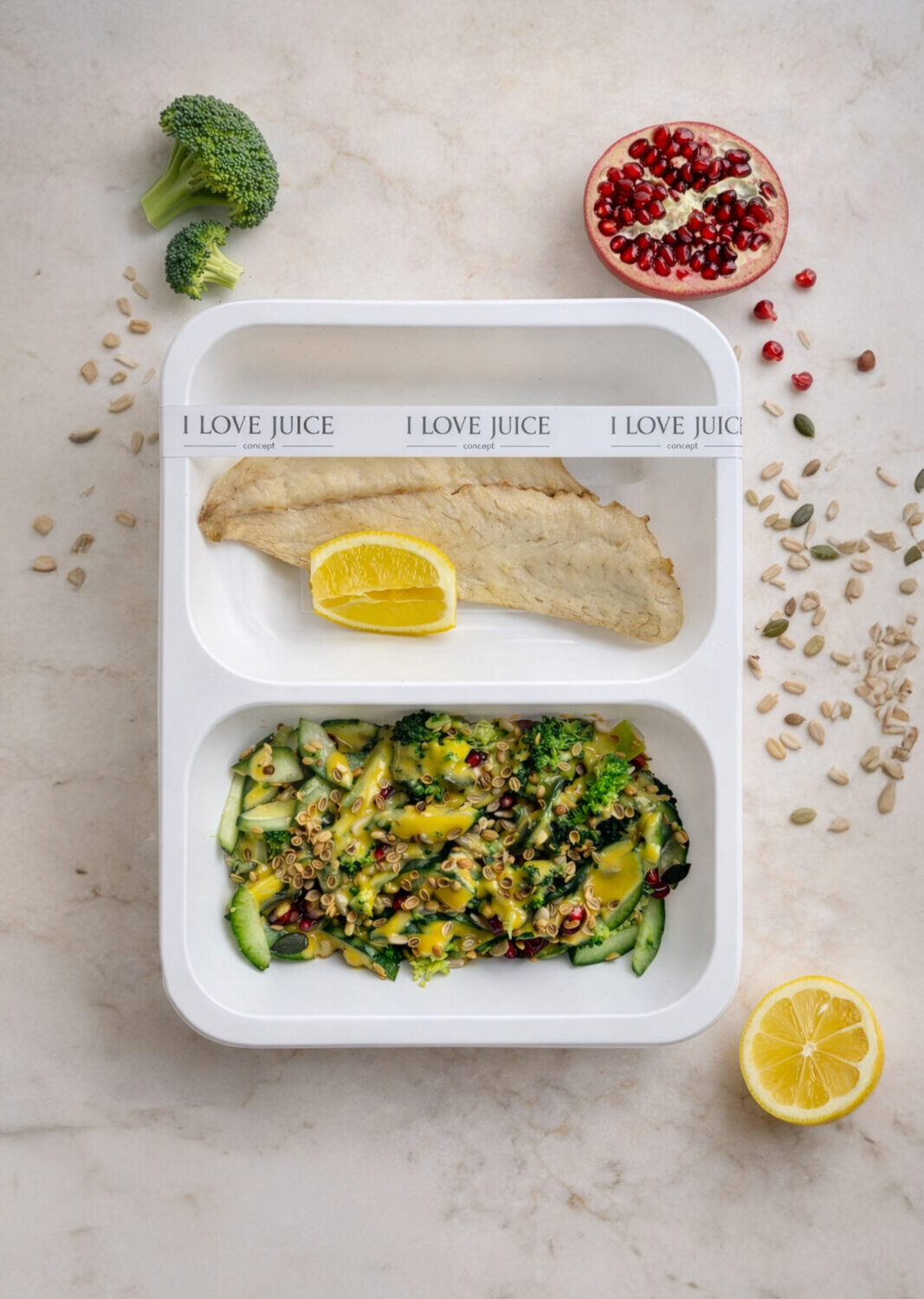 Dorsz skrei, zielony ogórek, ekologiczne ziarna słonecznika, ekologiczne pestki dyni, przeciwzapalny dressing z nutami grejpfruta, dijon, ziarna kolendry, pieprz cayenne, superfoods: siekany brokuł z zachowanym sulforafanem, oliwa z oliwek, owoc granatu, ekologiczny złoty len