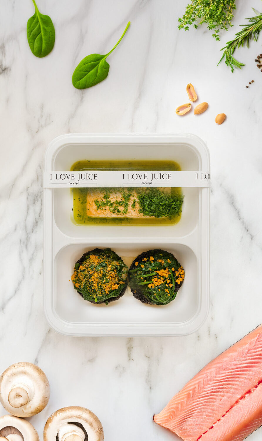 Łosoś Wester Ross pod chimichuri ze świeżych ziół, pieczarki portobello faszerowane szpinakiem i wegański parmezan z ekologicznych orzechów ziemnych (329 kcal, B: 35.5 g, W: 9.84 g, T: 17 g)